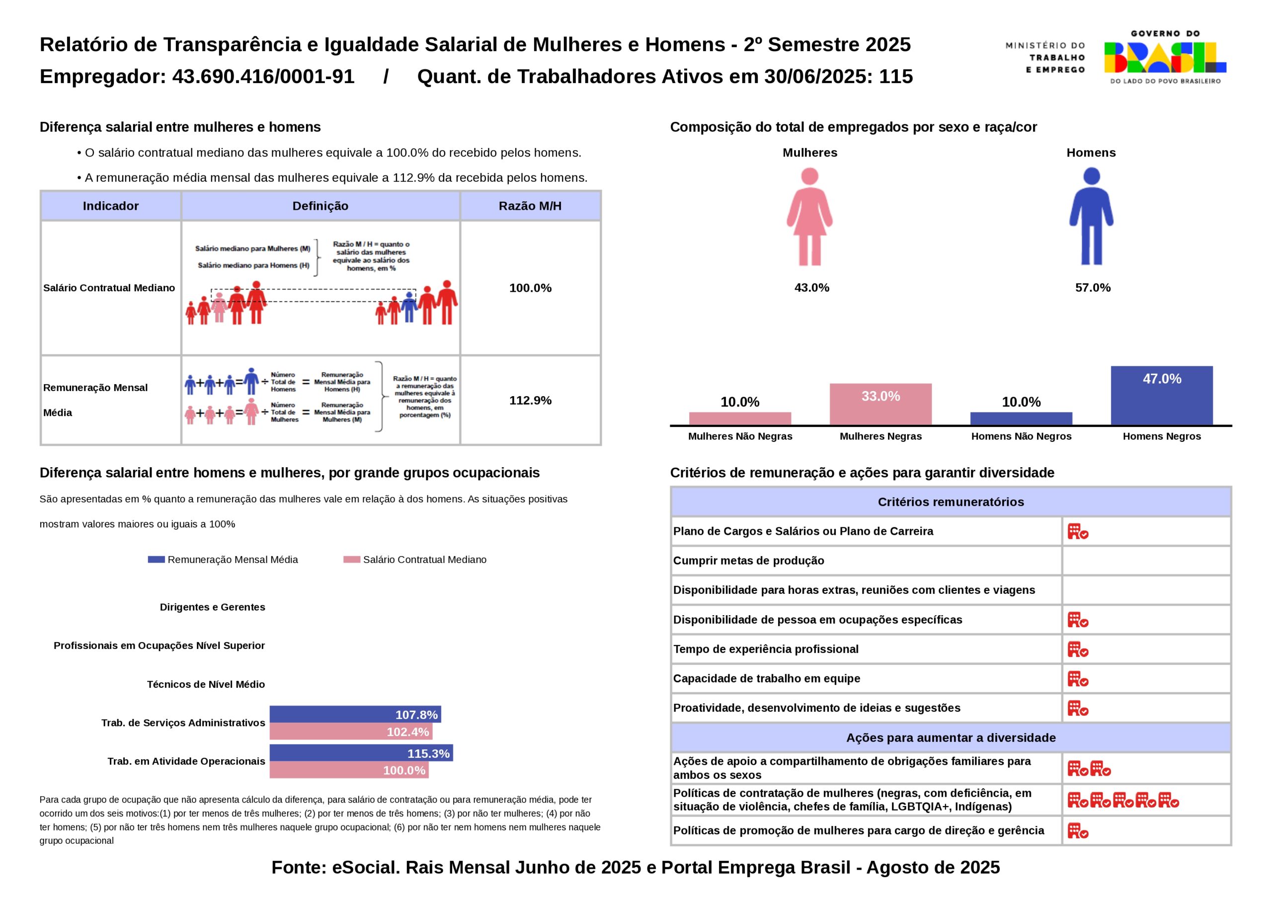 O relatório oficial pode ser consultado na imagem abaixo, que apresenta de forma clara os principais dados sobre a participação de homens e mulheres, a remuneração praticada e as ações voltadas à diversidade e equidade em nossa empresa.
